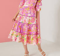 Tiered maxi skirt accented with embroidered trim. Elastic back waistband for easy fit and pull-on style. Pair with the Cara Top or Dani Tee for a full look. Partial lining.