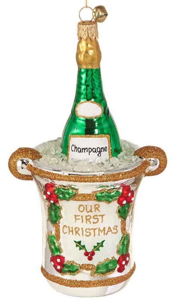 Mouth Blown, Hand Painted and Glittered in Poland Sterling Silver Lined Glass “Our First Christmas” Champagne Bucket Ornament Dated Upon Request 6″ Tall