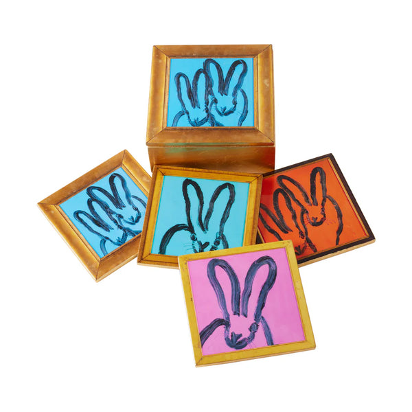 You'll find four fabulous bunnies inside the newest gold leaf coaster box by Hunt Slonem. Each coaster is unique - bunnies in blue, orange, turquoise and pink - all pictured...