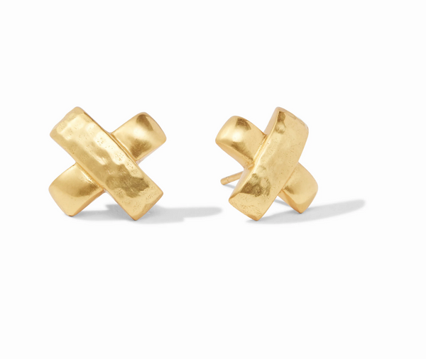 Smooth meets texture in the overlapping elements of the X-shape, a lightly hammered bar atop another bar with a satiny finish. Product Details 24K gold plate 0.5 inch length Julie...