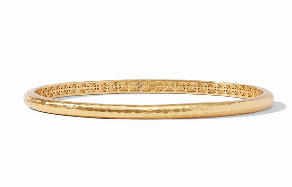 Elegant yet simple, this slim golden bangle features a lightly hand-hammered finish. An ornately geometric bas relief interior adds lightness and luxury for wearing stacked or solo. Product Details 24K...
