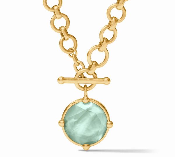 This demi-sized version of a favorite necklace has two ways to wear: Show the rose cut stone accented with golden beads or flip it to display a detailed bas relief...
