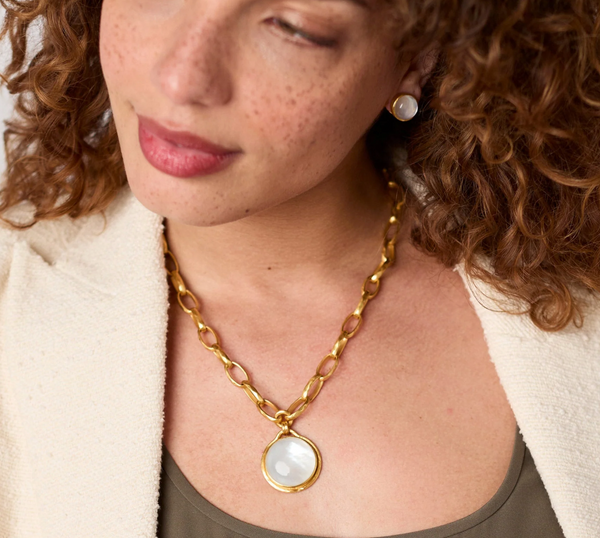 Product Details 24K gold plate, imported glass Length: 20 inches (adjustable) Pendant measures 1.3 inches Closes with toggle Julie Vos hallmark