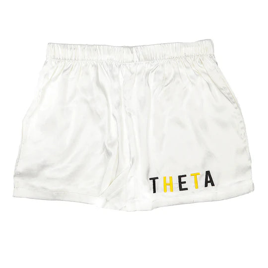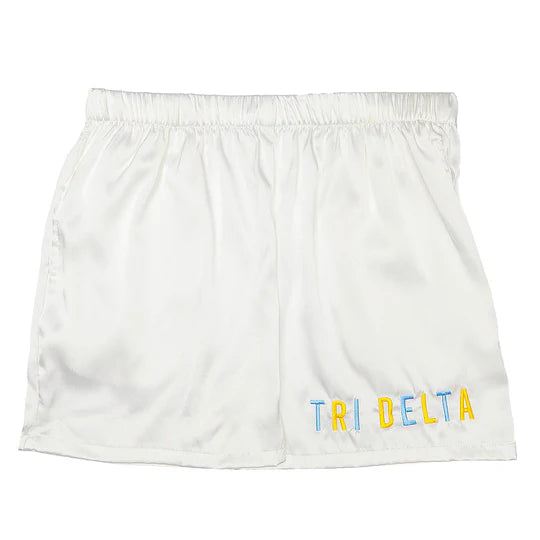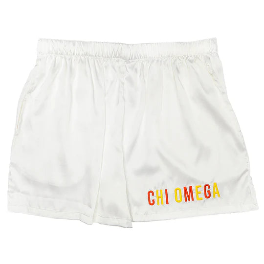 Get your best night sleep in our luxury satin collection! White satin is embroidered with your sorority name in your colors completed with a comfy elastic waist band and pockets....